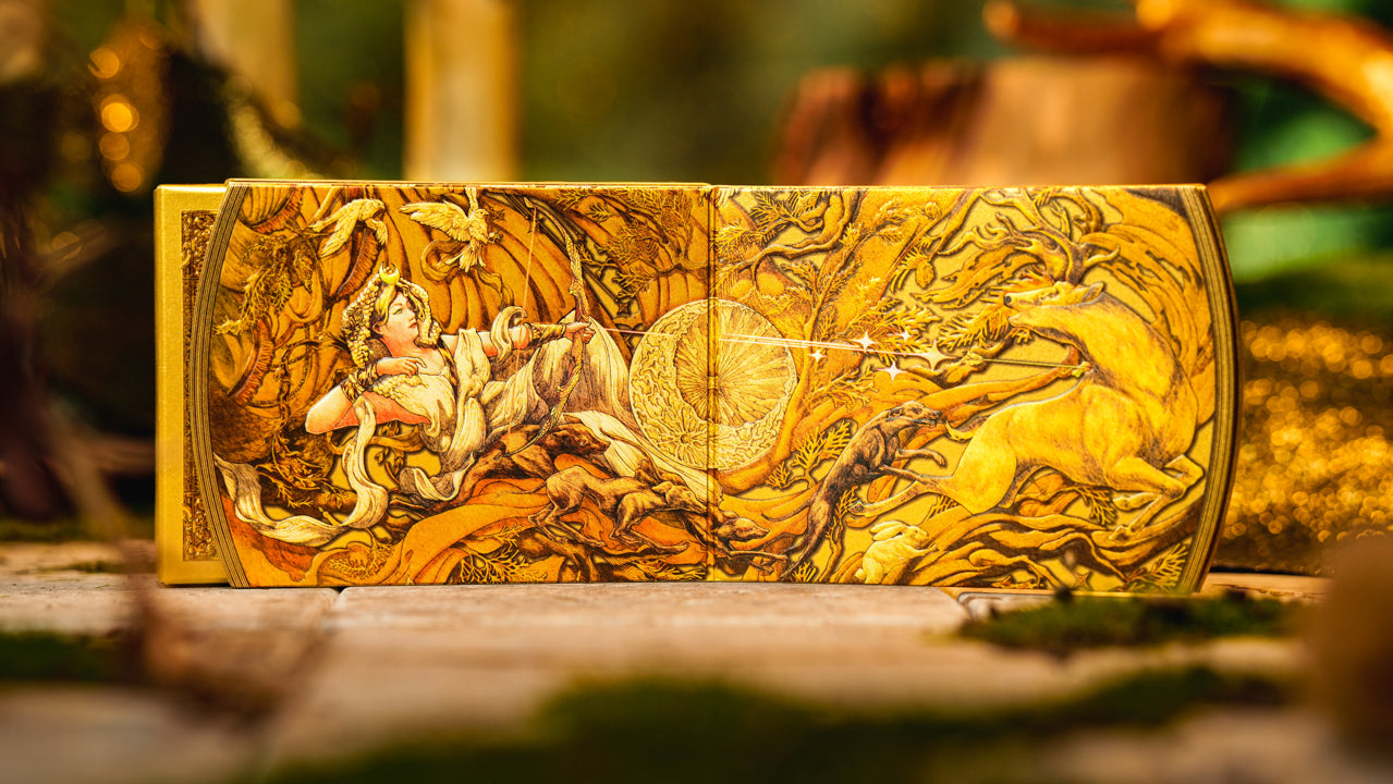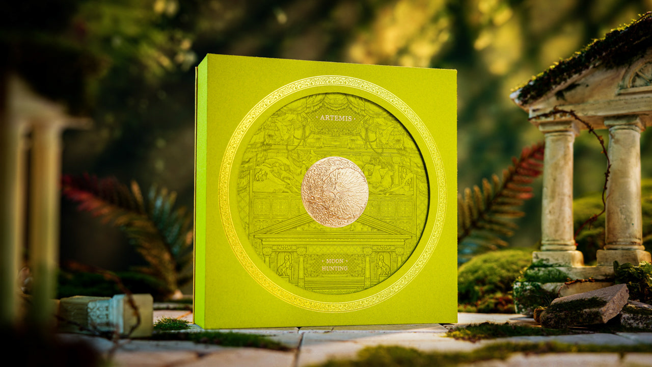 She chases the moon’s shadow through a silver-lit forest, bow in hand, protecting all living things.